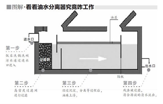 油水分離器究竟是如何工作的?其實(shí)原理非常簡(jiǎn)單,就是利用了“油和水密度不同”的物理原理。油水通過(guò)灶臺(tái)下水管道進(jìn)入油水分離器后,密度小的浮在上面、密度大沉在水底,經(jīng)過(guò)油水分離器的雜質(zhì)初濾箱和兩層復(fù)濾箱過(guò)濾分離,能自動(dòng)將廢水中的油、渣、水分開(kāi)。因?yàn)槲塾汀U棄物都被截留,排入下水道的則是廢棄污水,經(jīng)過(guò)設(shè)備處理的廢水基本不含油,這樣既避免下水道堵塞,還減少污染。