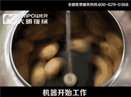 先將土豆地瓜等蔬菜置于水中2---5分鐘后,取出投入土豆去皮機筒內(nèi)按動開關,間斷給水,待0.2-1分鐘開閘即可。